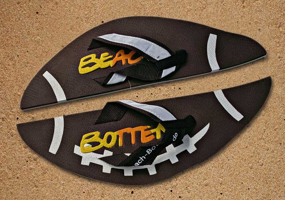 Zusammengestellte Zehentrenner ergeben die ersichtliche Vorlage für das anmutende Modell „Front Football“. Farblich in einem Braunton designt, wurde die Form dem weltbekannten Ball nachempfunden und detailliert gestaltet. Helle Streifen auf den BeachBotten symbolisieren die Nähte des Football. Ein feuriger BeachBotten-Schriftzug, steht für die Dynamik des Sports. Die Variante „Front Football“ lädt direkt zu einem sportlichen Spaziergang ein. Nicht nur Menschen, die vom Football-Sport begeistert sind, werden Dir zu lächeln. Gedanklich gesprochen – schaffst du einen Touchdown? Andere ungewöhnliche Modelle findest Du im Shop, sieh dich um und entdecke die Welt der BeachBotten.