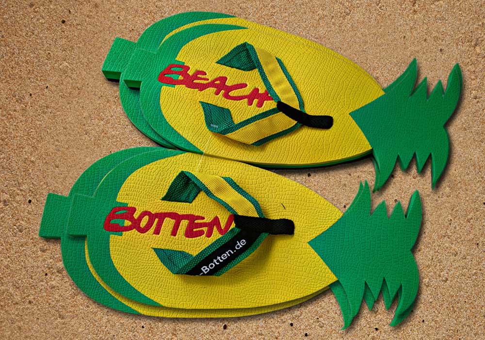 Etwas sommerliche Musik für die Sinne, dazu ein frisches Getränk im Sonnenschein und schon entstand der Plan für das Modell „Orient Pineapple“. Diese BeachBotten sind bildhaft deutlich als Ananas erkennbar. Sie wurden farbig in Sattem gelb und lebendigem grün designt. Dazu noch ein auffallender BeachBotten-Schriftzug, so ist diese Variante in einer großen und oder einer kleineren Form erhältlich. Im Shop findest Du noch andere coole Obst-Modelle, Zehentrenner, die auffallen und (D)ein Leben bunter machen.