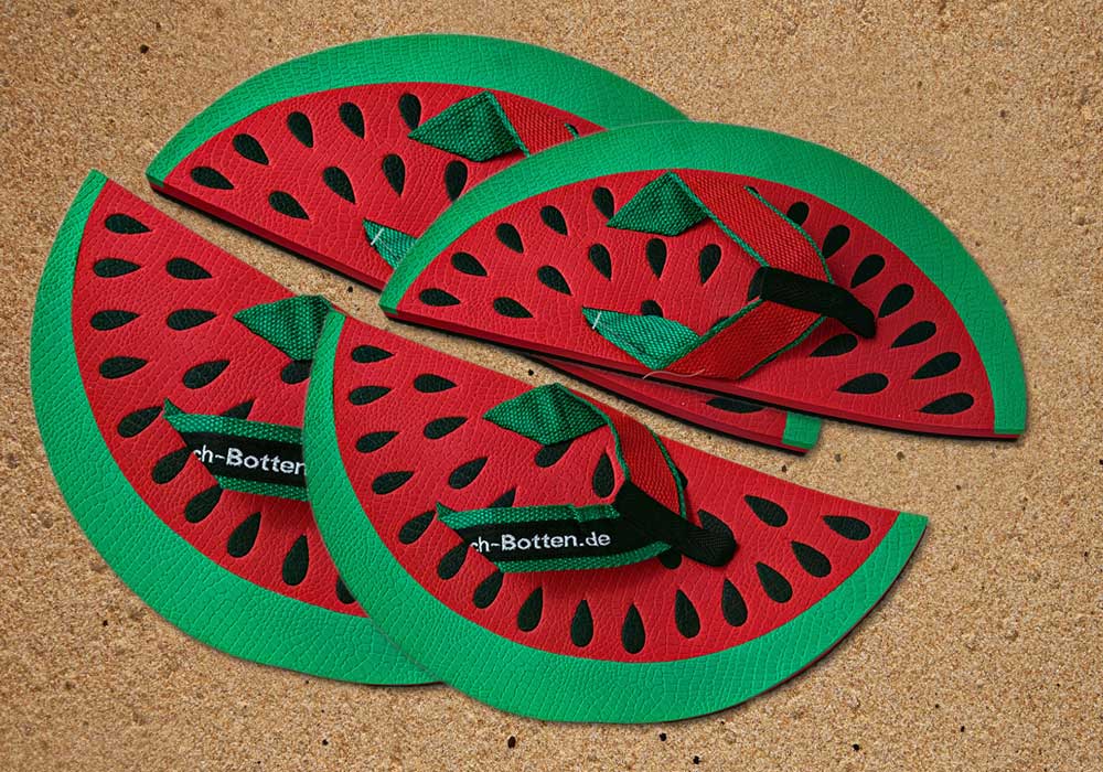 Eine Prise sommerliche Frische, ein allseits beliebtes Obst in der warmen Jahreszeit, so beschreibt sich das Modell „Wild Melone“. Dem Obst auch farblich nachempfundene BeachBotten, detailgetreu vom Rand bis zu den dunklen Kernen. Wenn die Zehentrenner nah beieinander stehen, macht es den Eindruck, als wäre es eine halbierte Frucht. Diese Variante ist in größerer und in einer kleineren Form erhältlich, so fern im Online-Shop für flotte Badeschuhe noch zu haben. Weitere farbenfrohe Obst-Varianten kannst Du im Shop entdecken.