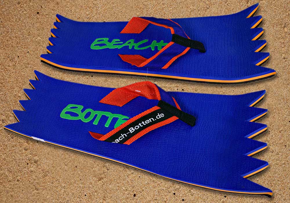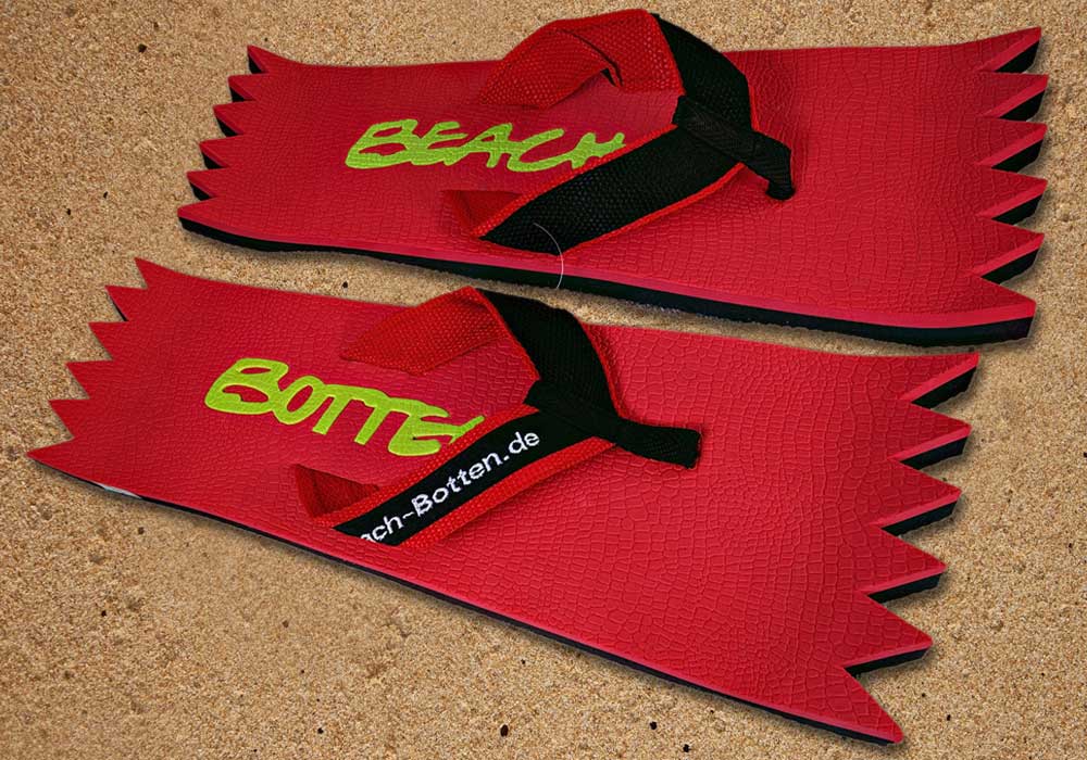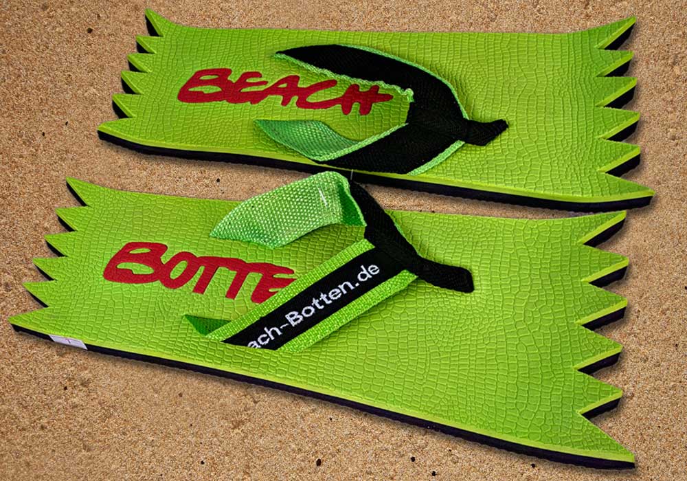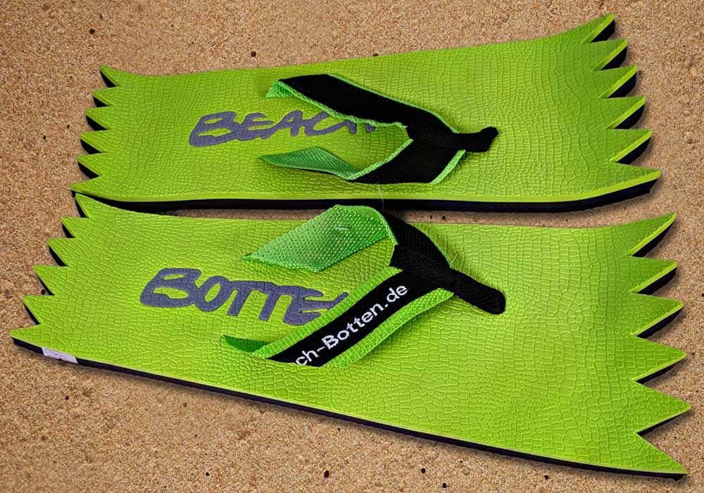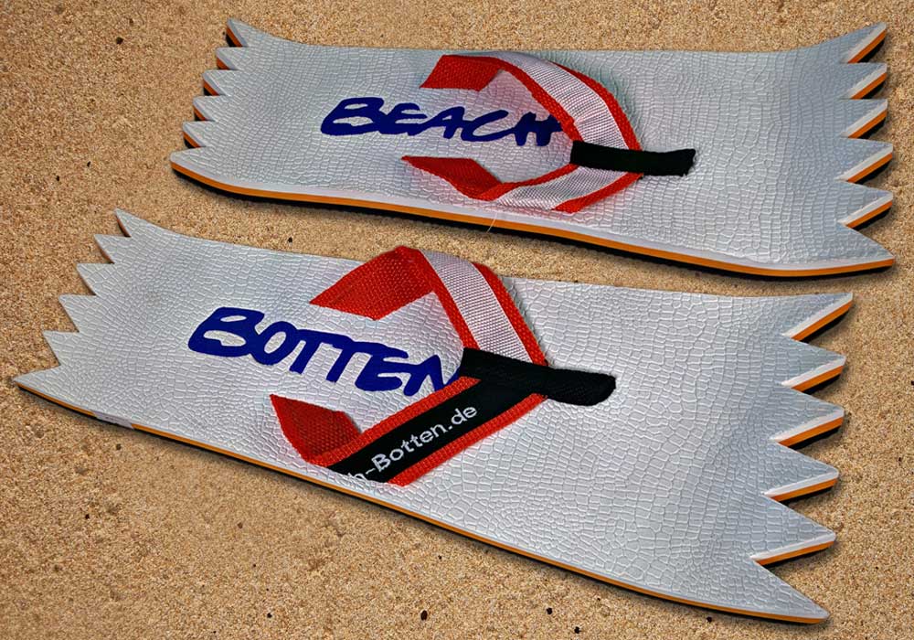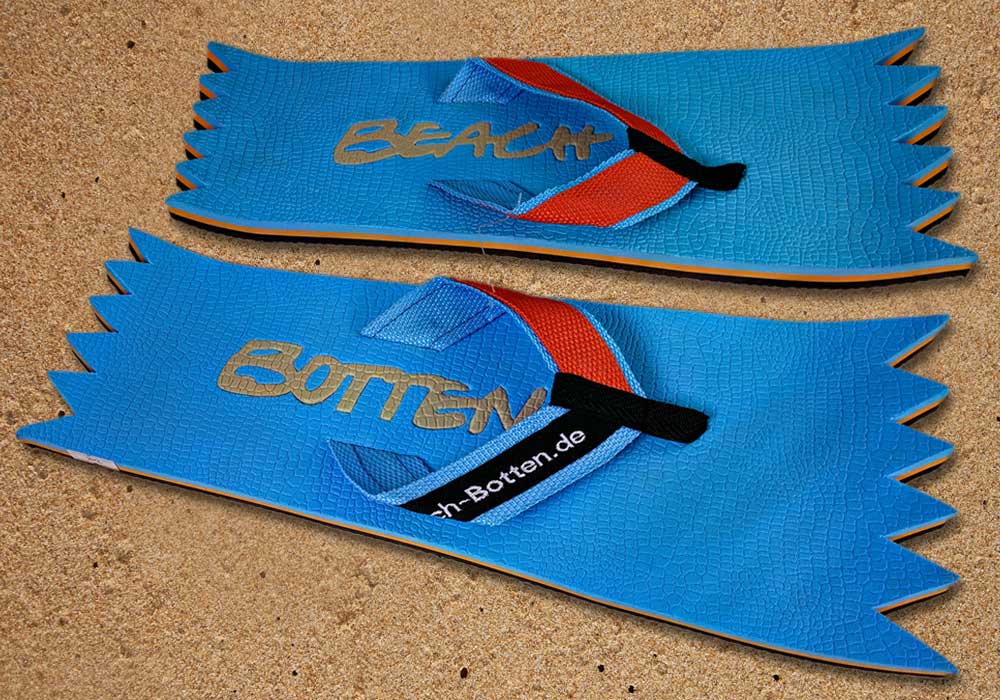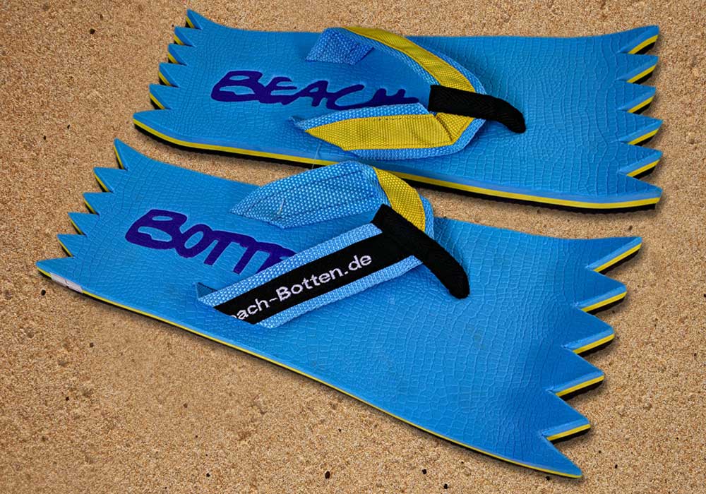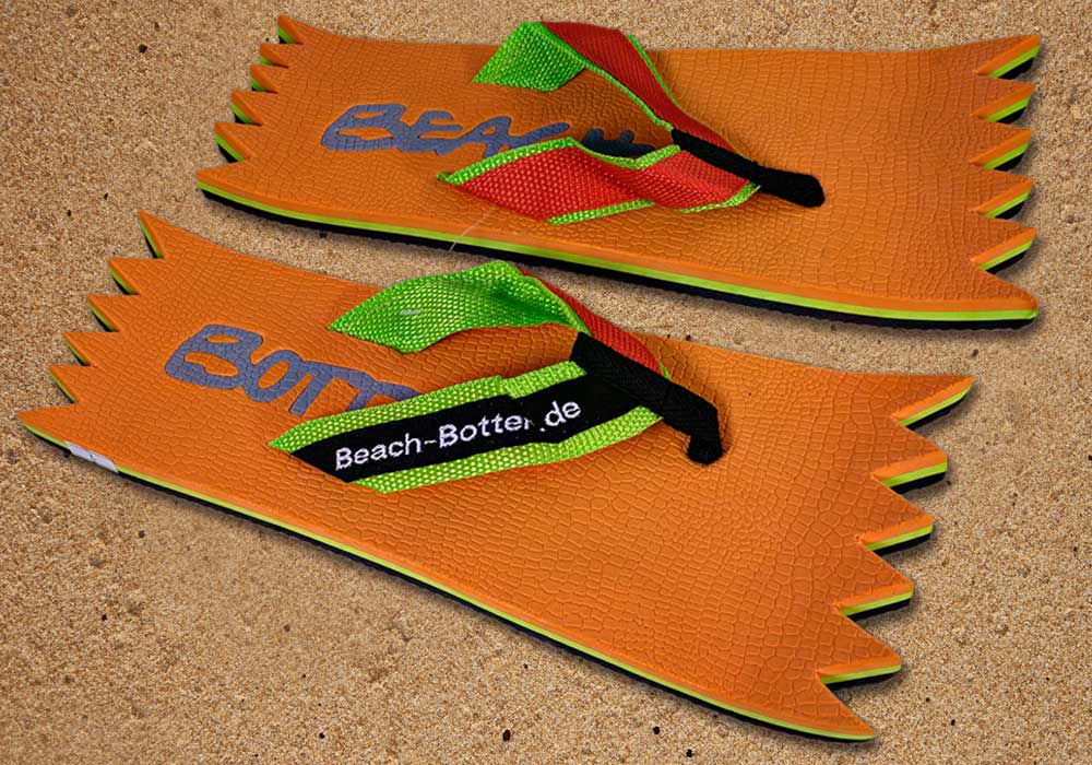 Die dynamische Variante „Foot Double Spike“ hat hinten und vorne eine Zacken-Form. Die Zehentrenner dieses BeachBotten-Modelles, haben oben und unten eine Farbe und zusätzlich einen farbigen Schriftzug. Wenn dieses Modell, das wenn vorrätig in kleiner und in einer größeren Form im Online-Shop erhältlich ist, vorne und hinten leicht hochgeklappt wird, sieht es gleich ganz anders aus und kann mit ein wenig Ironie auch als Sand-Abstandshalter gewertet werden. „Foot Double Spike“ macht in jeder Sicht eine flotte Figur, nicht nur an dir und deinen Freunden. Gönne Dir das Besondere.