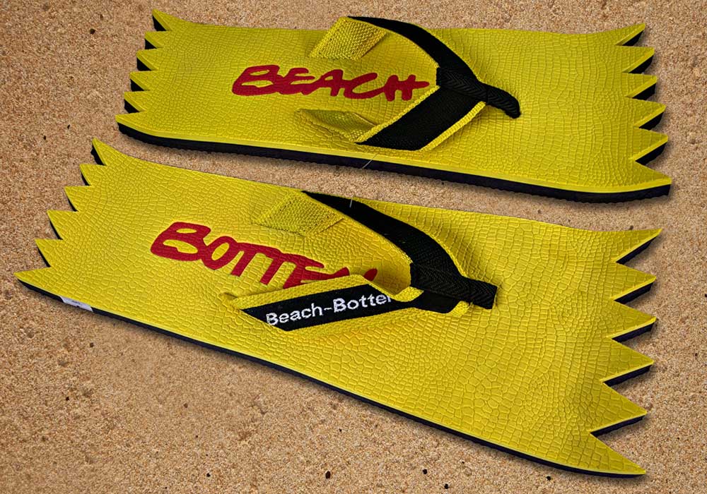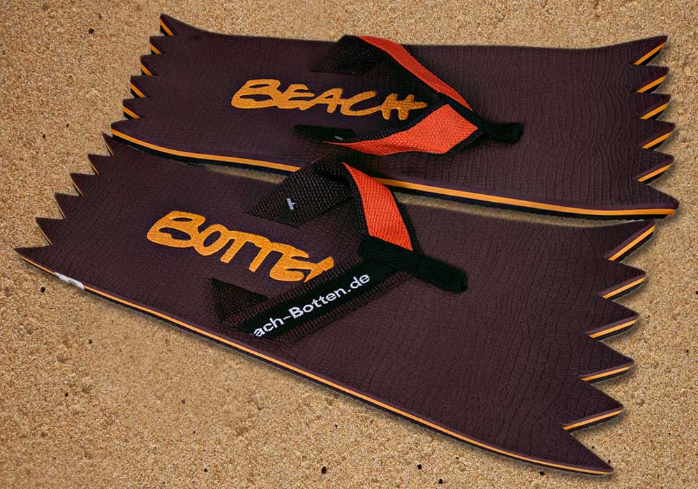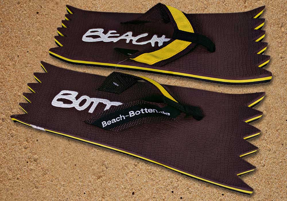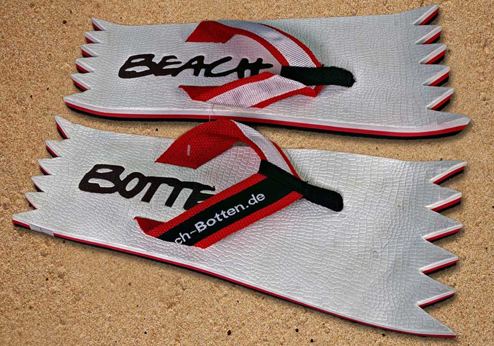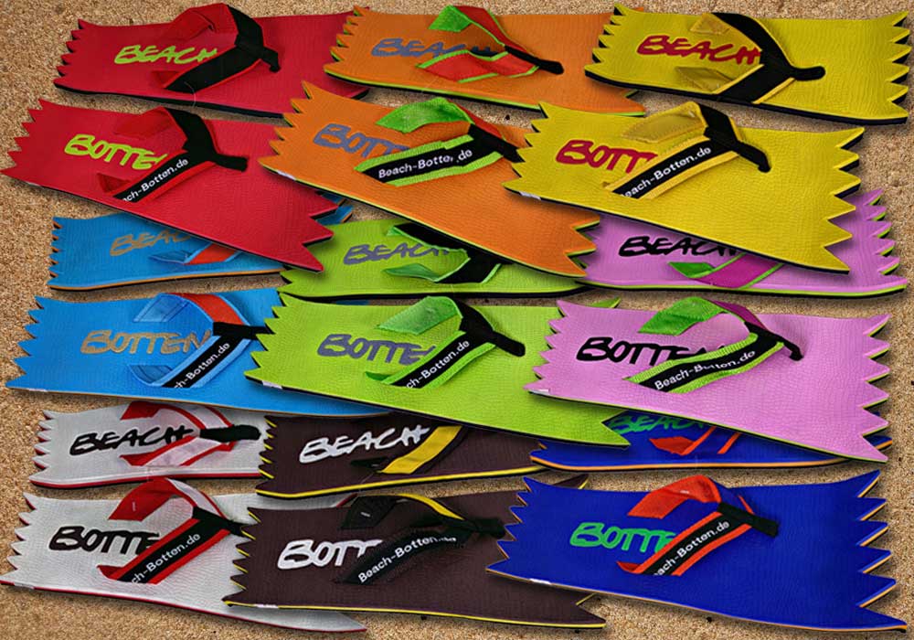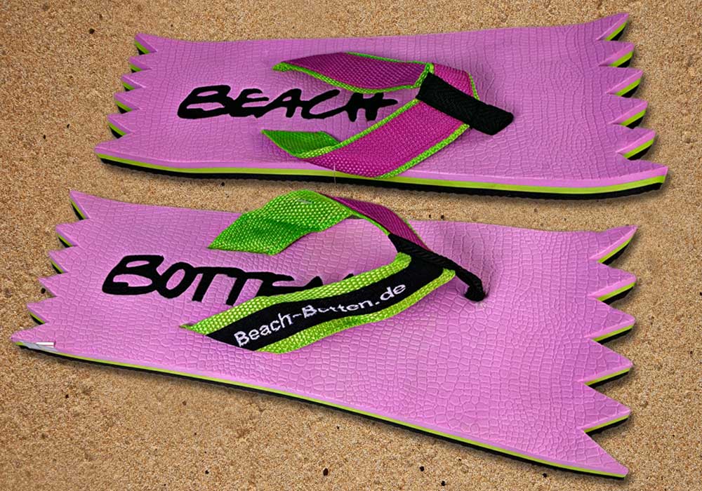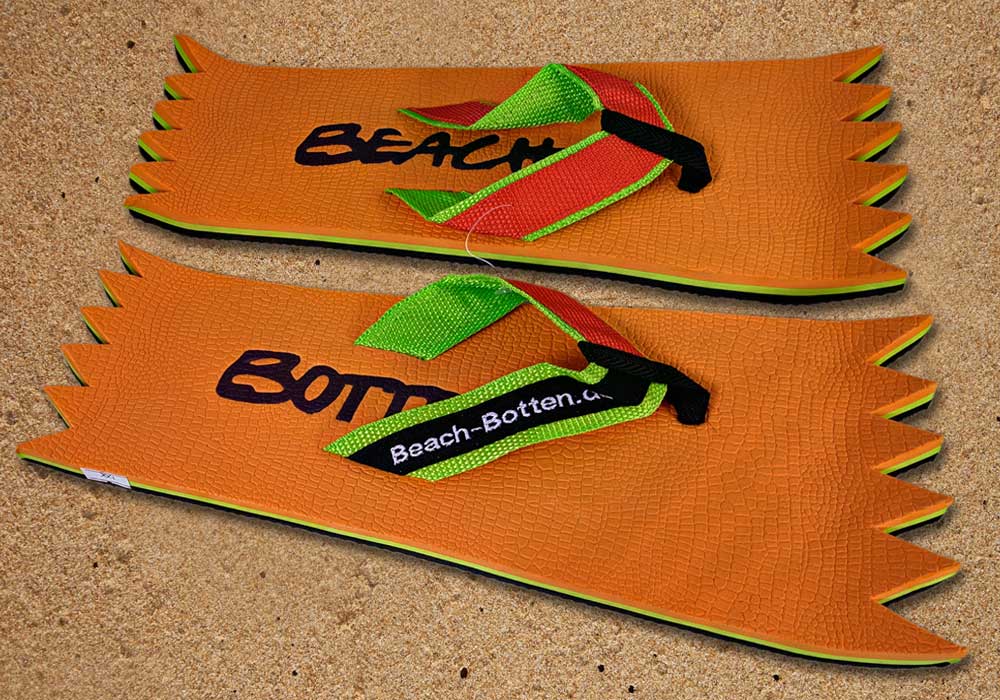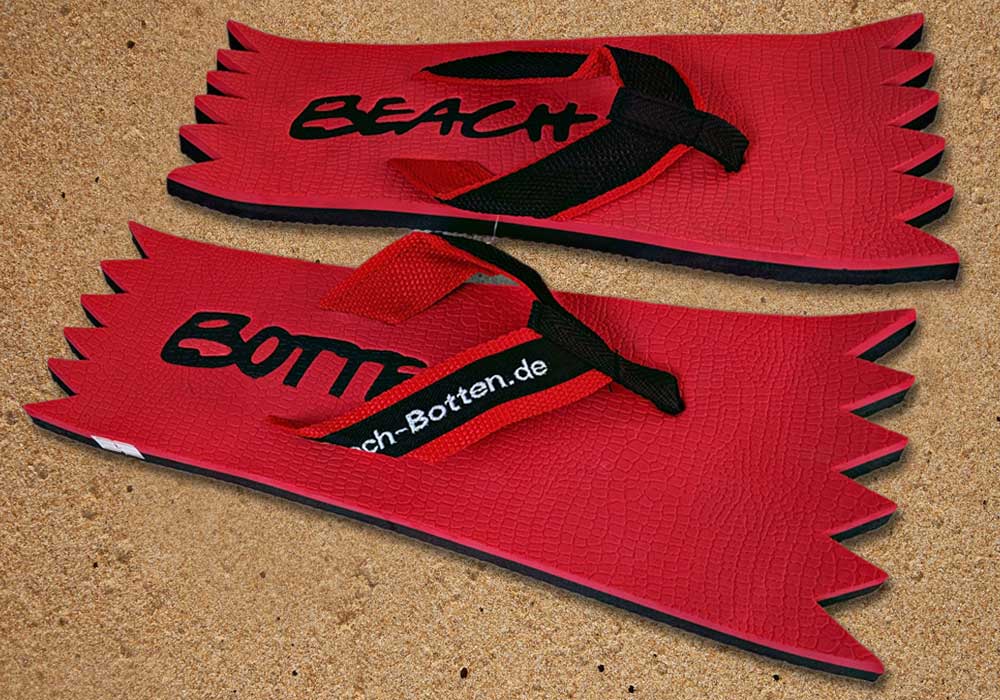 Die dynamische Variante „Foot Double Spike“ hat hinten und vorne eine Zacken-Form. Die Zehentrenner dieses BeachBotten-Modelles, haben oben und unten eine Farbe und zusätzlich einen farbigen Schriftzug. Wenn dieses Modell, das wenn vorrätig in kleiner und in einer größeren Form im Online-Shop erhältlich ist, vorne und hinten leicht hochgeklappt wird, sieht es gleich ganz anders aus und kann mit ein wenig Ironie auch als Sand-Abstandshalter gewertet werden. „Foot Double Spike“ macht in jeder Sicht eine flotte Figur, nicht nur an dir und deinen Freunden. Gönne Dir das Besondere.