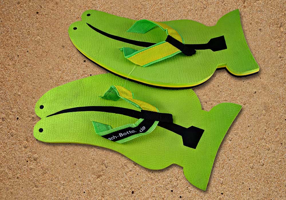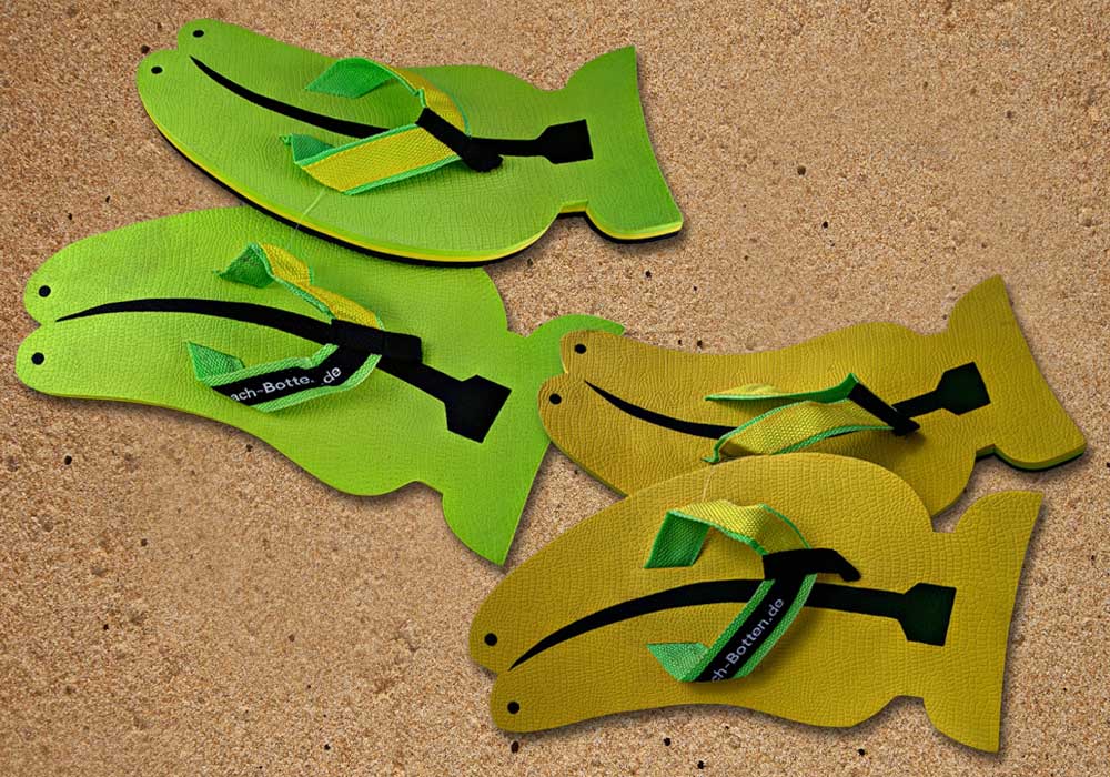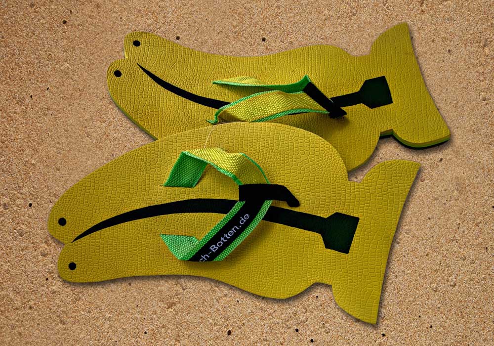 Kräftig in einem Gelbton oder in unreifem frischem hellgrün wartet das BeachBotten-Modell „Double Banana“ auf Deinen Blick. Zu erwerben in kleinerer und größerer Form, je nach Farbwunsch oder Fußlänge. Die beiden Bananen kommen in fast original getreuer Farbe zu Dir an die Füße. Ein besonderes Merkmal ist die Form dieser Badeschuhe. „Double Banana“ zeigt nach hinten heraus absichtlich in entgegengesetzte Richtung und kann dadurch zusätzlich für kuriose Gesichter sorgen. Aber Vorsicht nicht das du auf einer Safari oder auch im Zoo noch andere Bananen-Freunde anziehst. Weitere originelle BeachBotten Obst-Typen findest du im Shop.