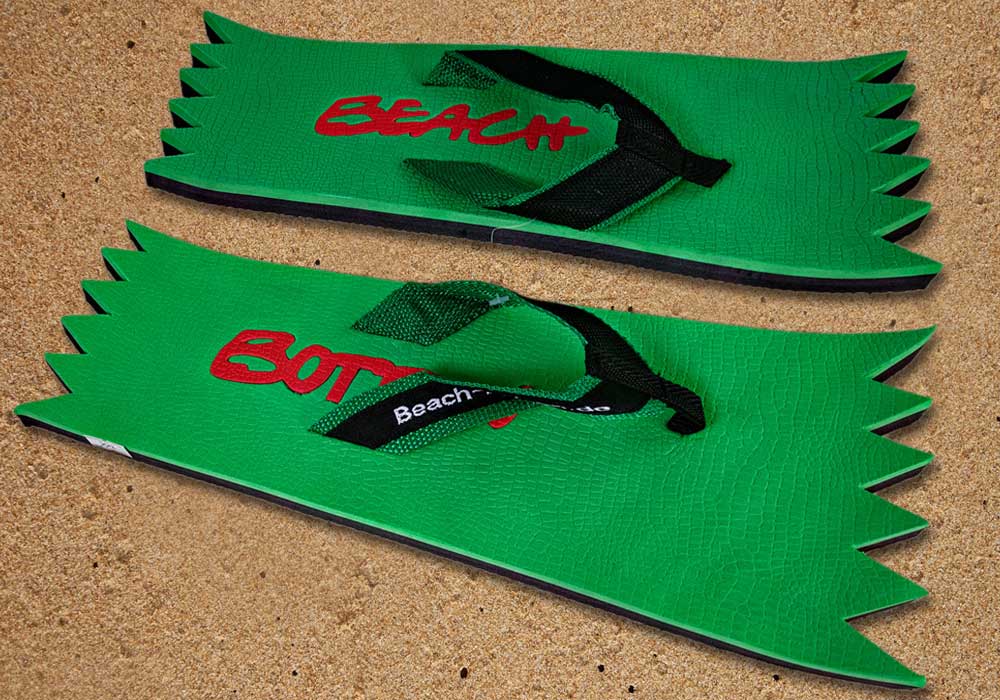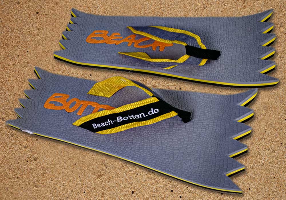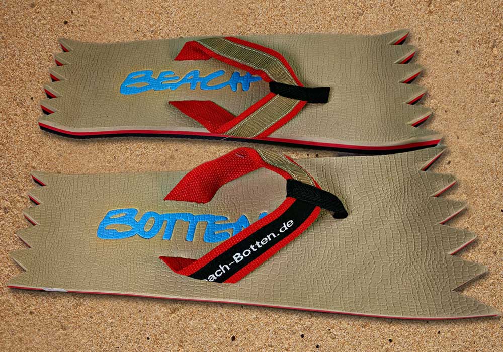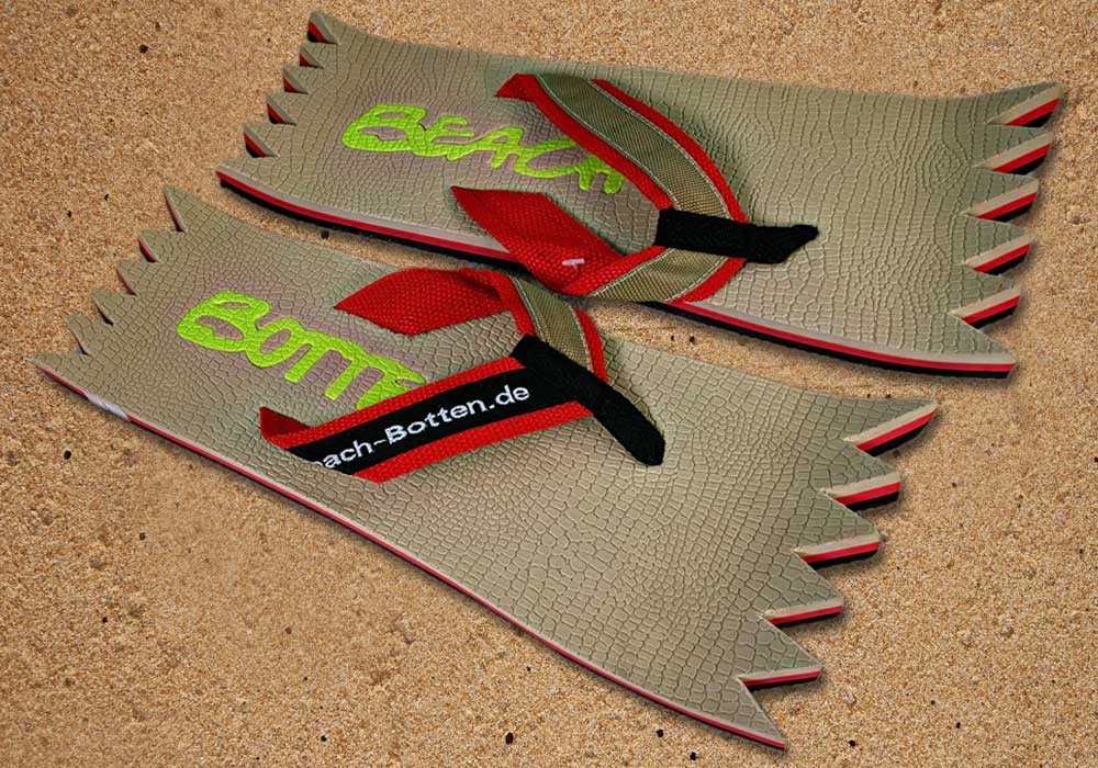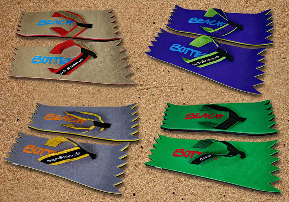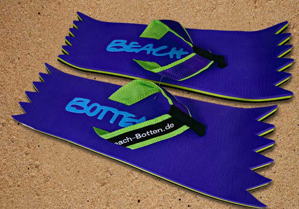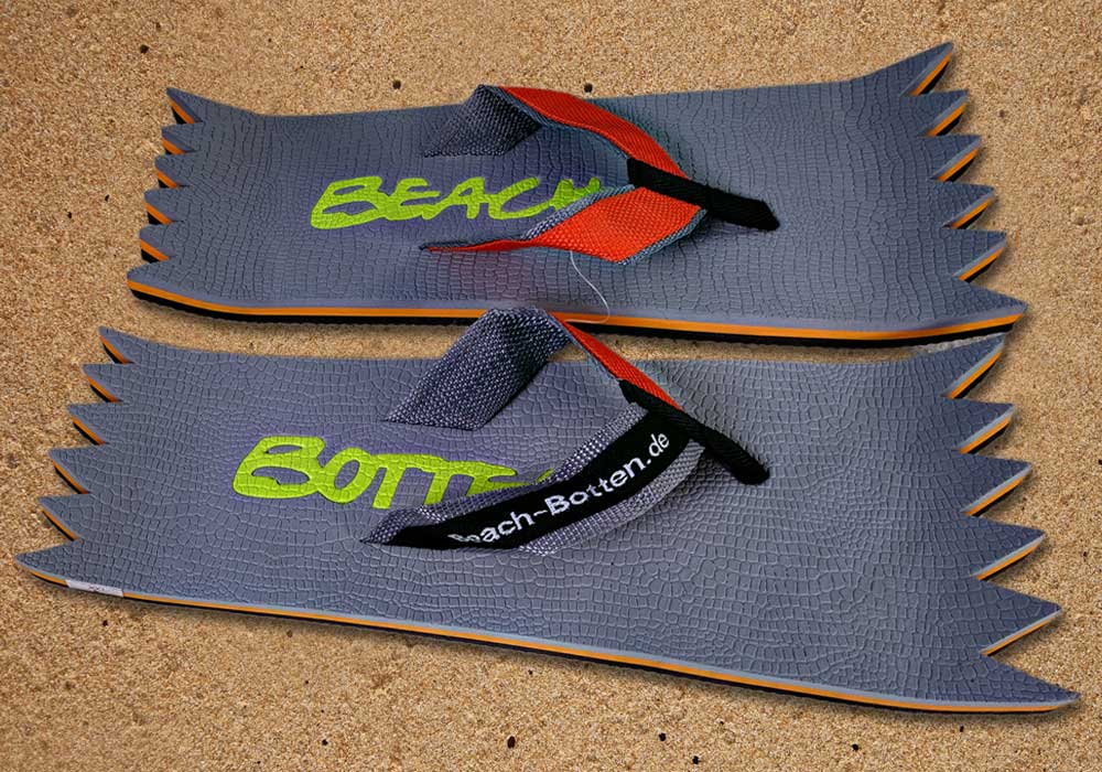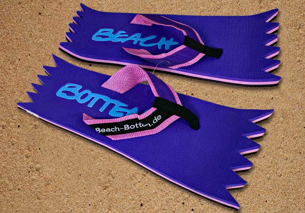 Die dynamische Variante „Foot Double Spike“ hat hinten und vorne eine zackige Form bekommen. Alle Zehentrenner dieser BeachBotten-Variante, haben unten und oben eine Farbe und dazu einen farbigen Schriftzug. Wenn dieses Modell, dass wenn vorrätig in kleiner und in einer größeren Form im Online-Shop zu erwerben ist, vorne und hinten leicht hochgeklappt wird, sieht es gleich etwas anders aus und kann mit ein wenig Humor auch als Sand-Abstandshalter gewertet werden. „Foot Double Spike“ macht in jeder Sicht eine flotte Figur, nicht nur an dir und deinen Freunden. Gönne Dir mit Beachbotten etwas Ungewöhnliches.