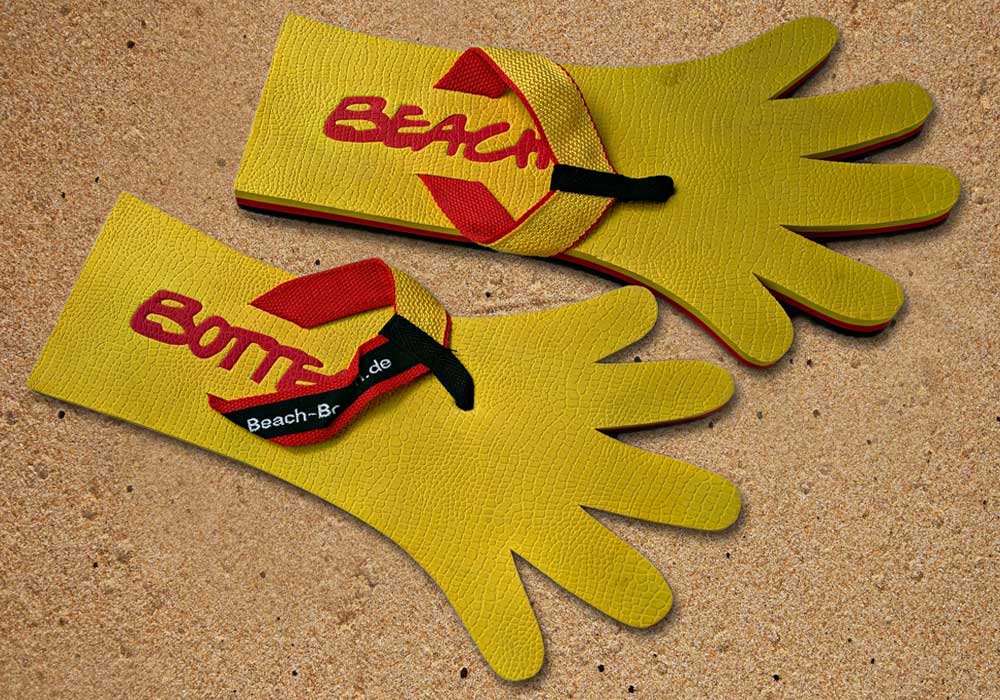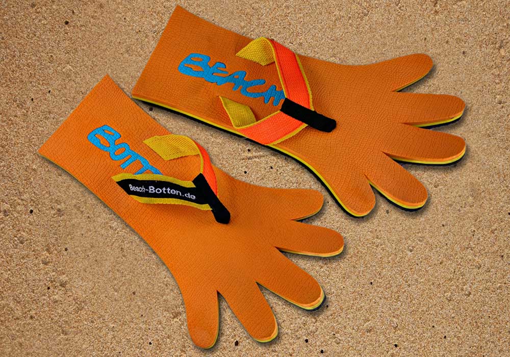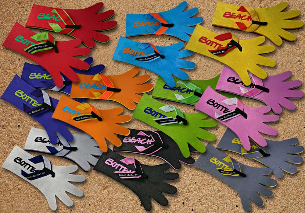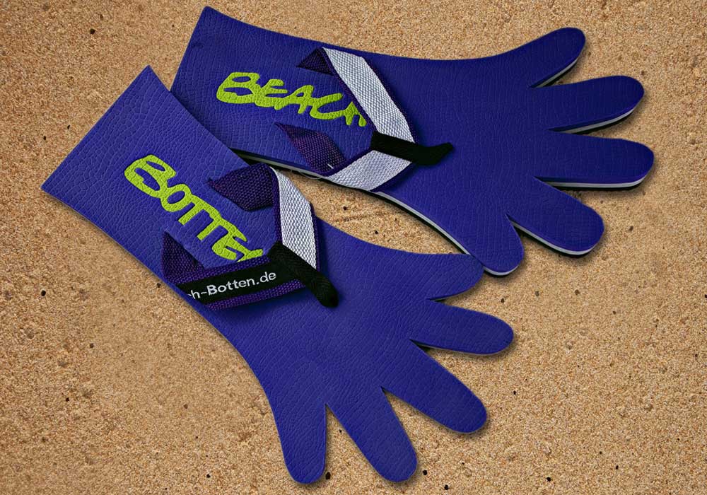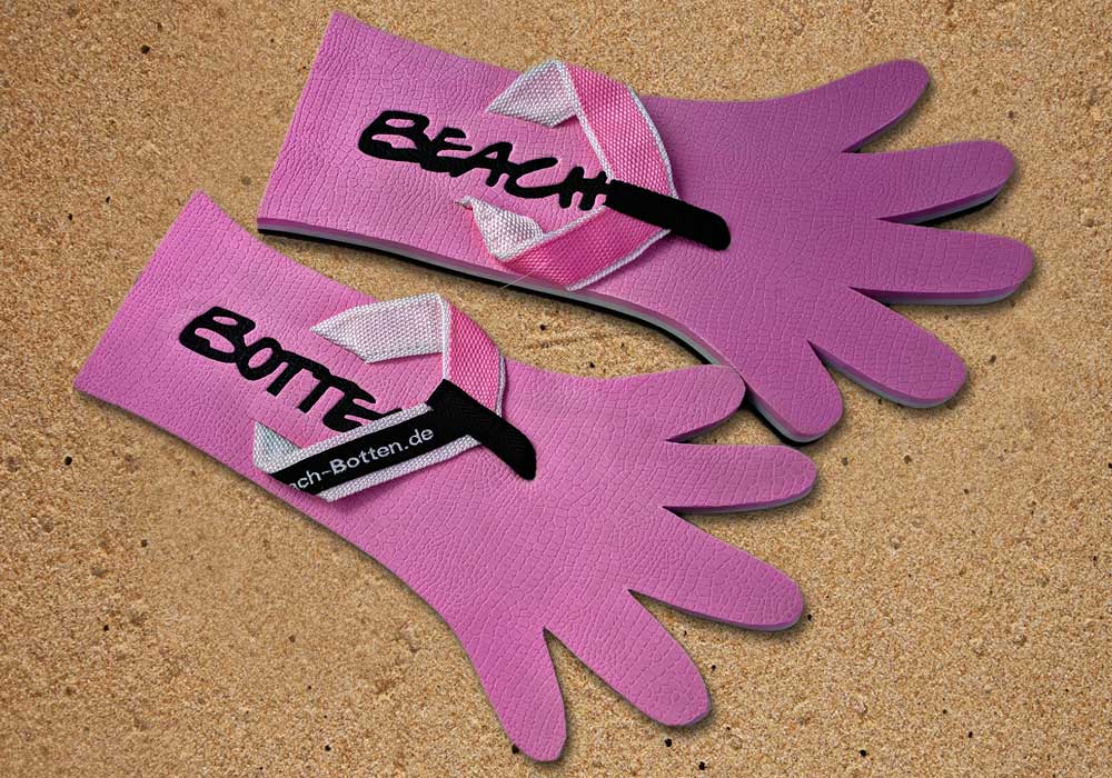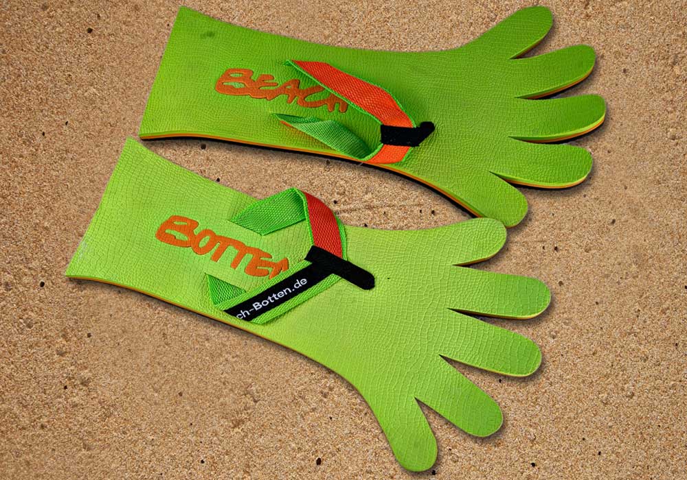 Die Idee für das Modell „Foot Hand“ geht viele Jahrhunderte zurück. Inspiriert von der Zeit, als wir Menschen uns noch auf allen vieren fortbewegten. Fünf formalisierte Finger bilden den vorderen Bereich der Zehentrenner. Diese lebhafte Variante hat außerdem einen farbigen BeachBotten-Print. Als besonderen Spaß gibt es die Möglichkeit, jeden einzelnen Badelatschen-Finger leicht empor zu biegen und damit das Design optisch zu verändern. Ist Dir „Foot Hand“ verrückt genug? Schau dich im Online-Shop auch nach anderen peppigen Modellen um.