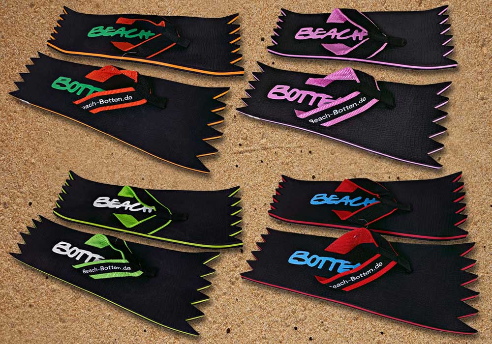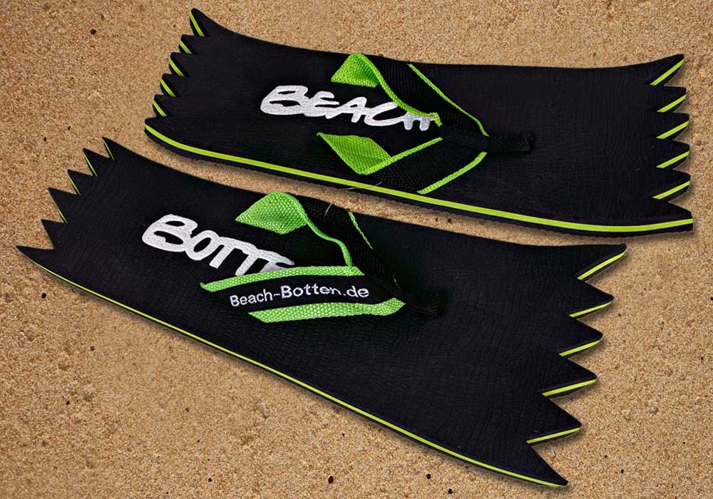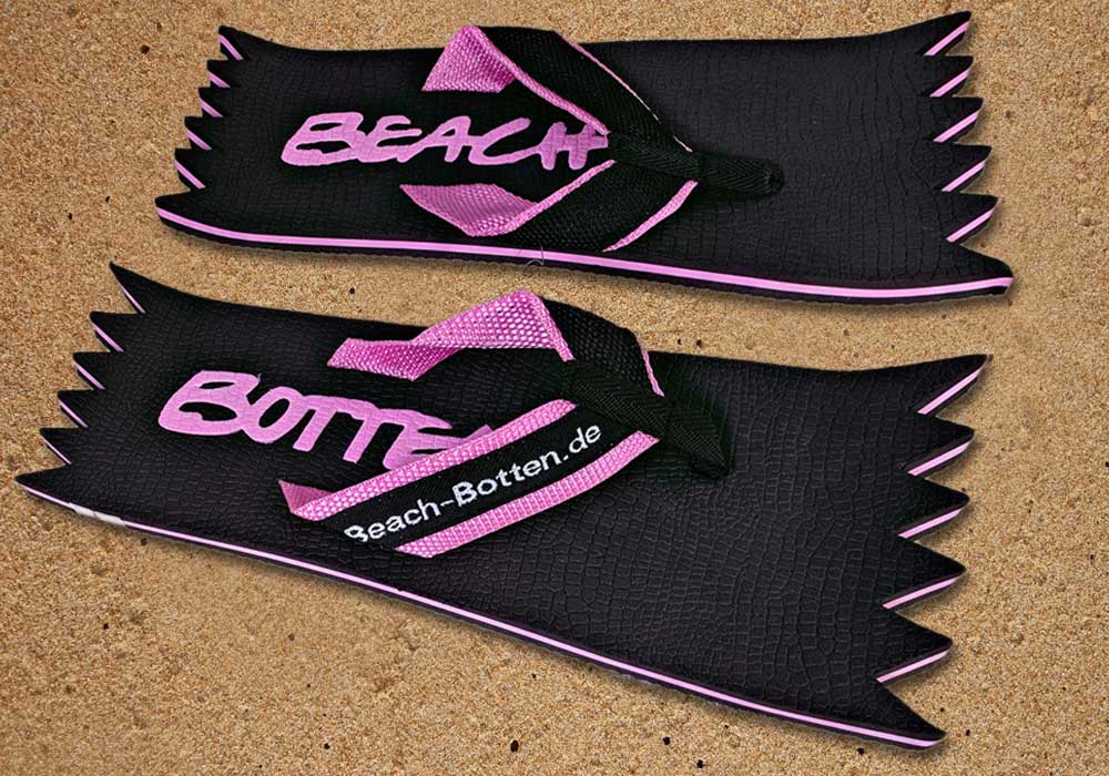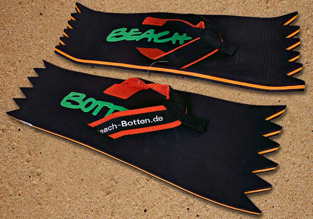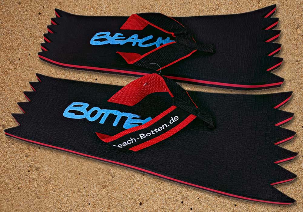 Die schwarze Variante „Foot Double Spike“ hat hinten und vorne eine Zacken-Form. Alle Zehentrenner dieses BeachBotten-Modelles, kommen dezent in schwarzer Farbe mit weiteren farbigen Details und Schriftzug. Wenn dieses Modell, das wenn vorrätig in zwei Größen im Online-Shop erhältlich ist, vorne und hinten leicht hochgeklappt wird, sieht es gleich anders aus und kann mit ein wenig Fantasie auch als Sand-Abstandshalter angesehen werden. „Foot Double Spike“ macht in jeder Sicht einen dynamischen Auftritt, nicht nur an dir und deinen Freunden. Gönne Dir das Besondere.